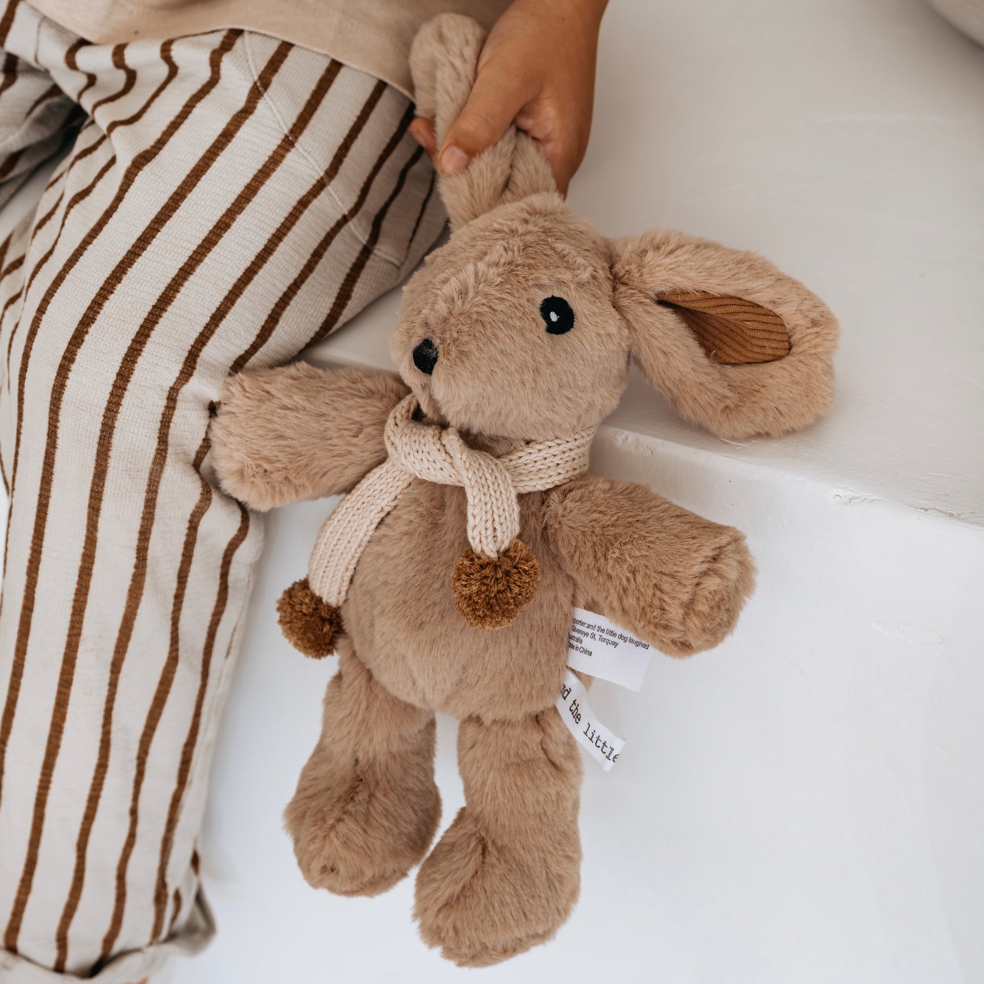 Hugh rabbit has an adorable caramel buttery soft fur and wears a vanilla knitted scarf made with Australian merino wool and caramel pom pom.