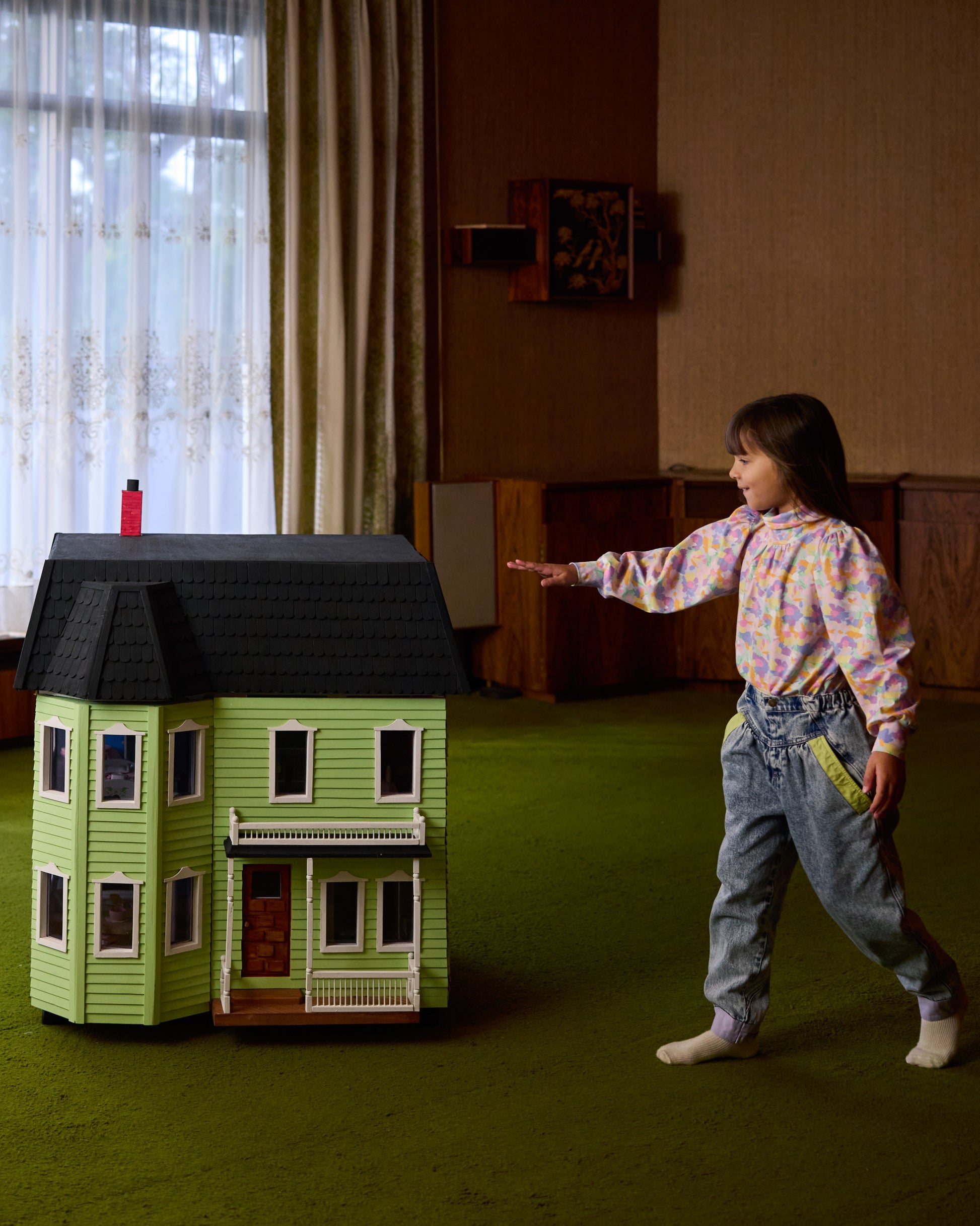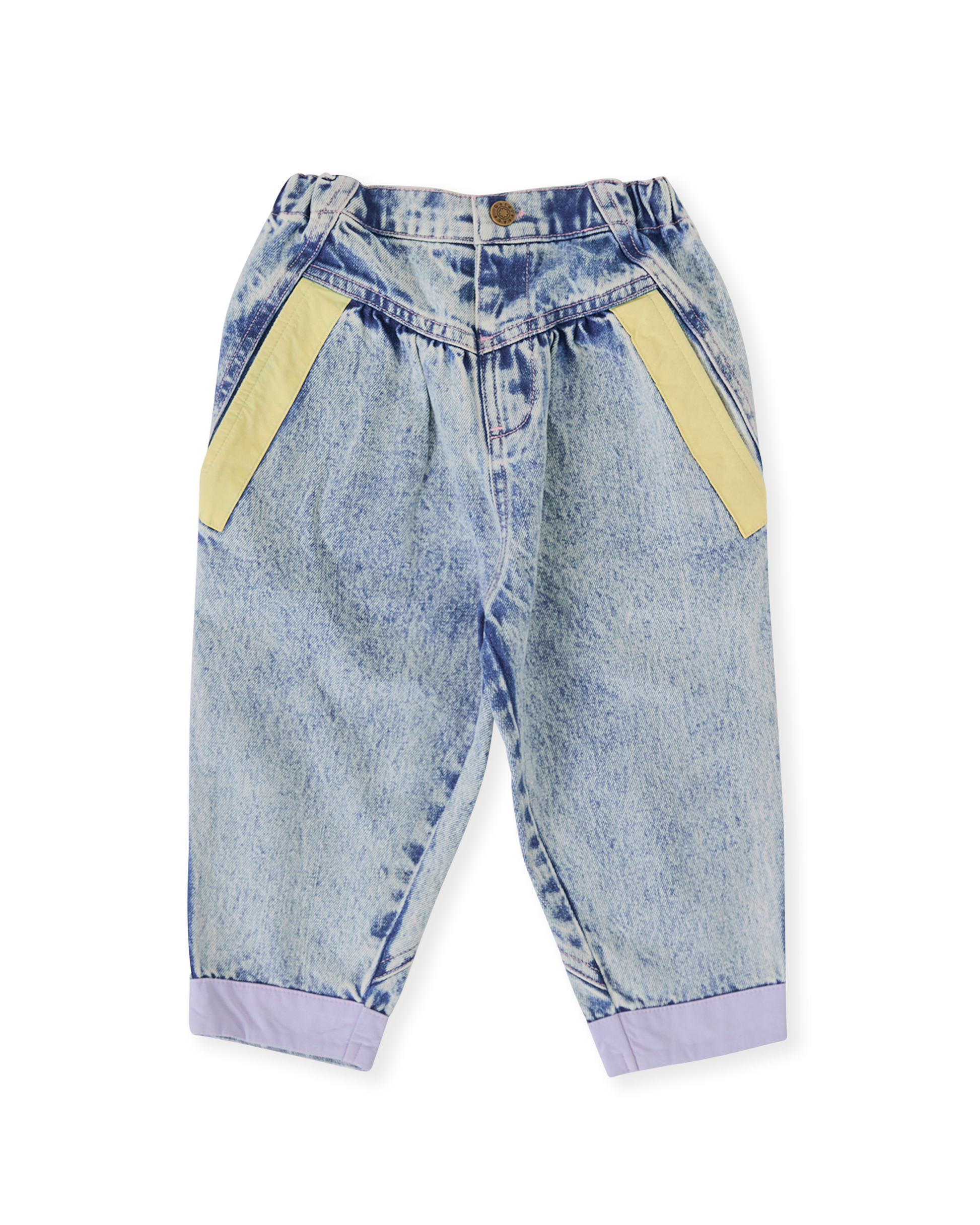 True to size. Retro style mid-rise denim pants. Featuring a yoke front and an adjustable, elasticated waist and pastel pops of colour throughout. A staple denim piece that pairs back with everything.