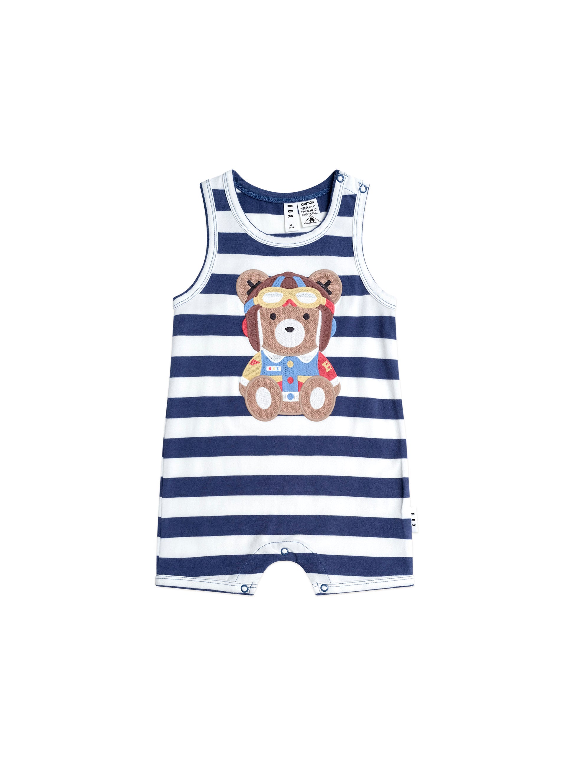 A marshmallow-soft striped romper with fun and furry pilot Huxbear embroidery. Consciously crafted from premium organic cotton, it has stainless steel snaps at the shoulder and crotch for super snappy dressing. Just add squishy legs.