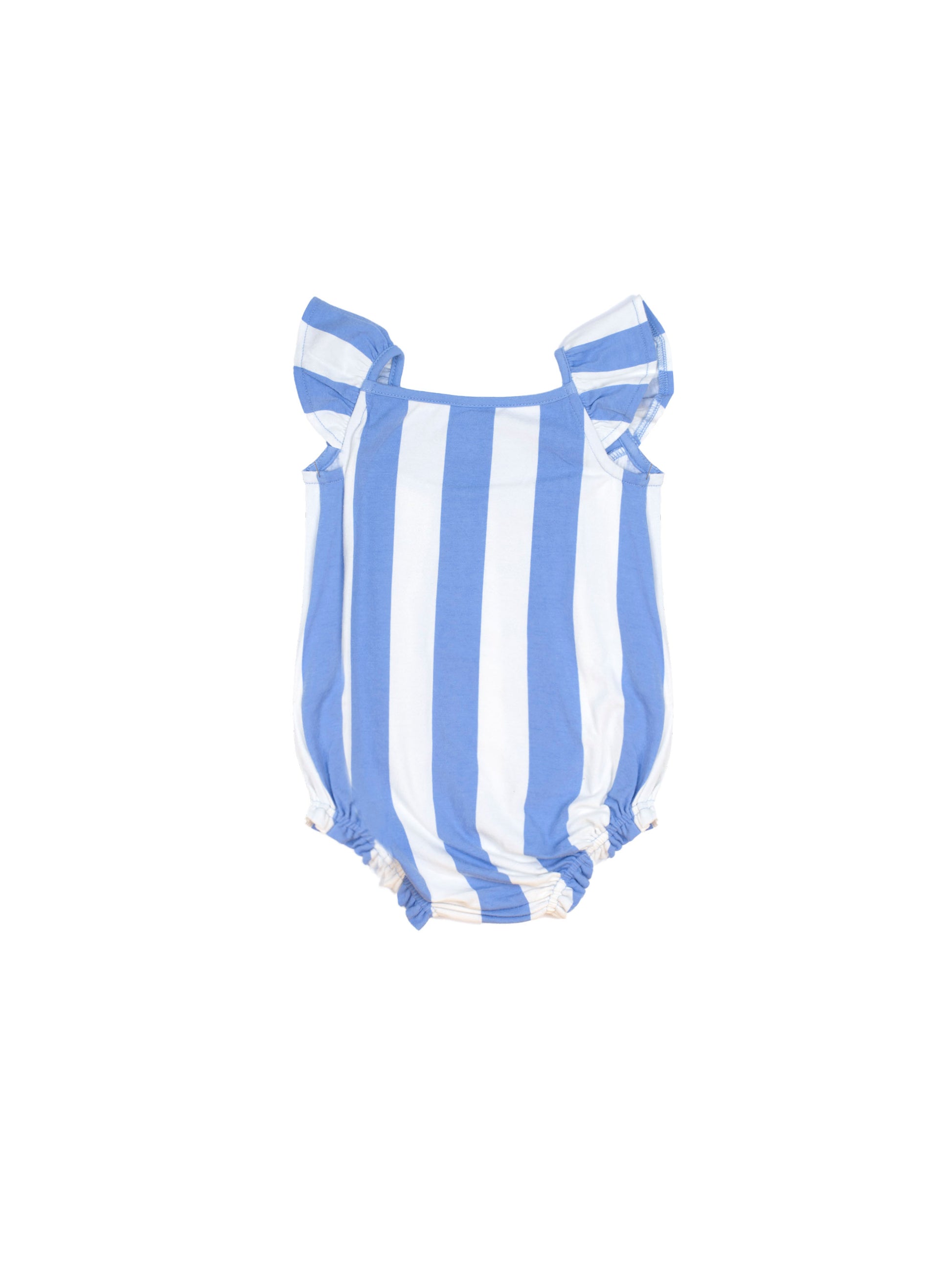 The prettiest playsuit you’ve ever seen. Made from buttery soft organic cotton in seaside stripes, it features sweet shoulder ruffles and embroidered cherry details. Stainless steel crotch snaps for snappy changes. Just add squishy legs.
