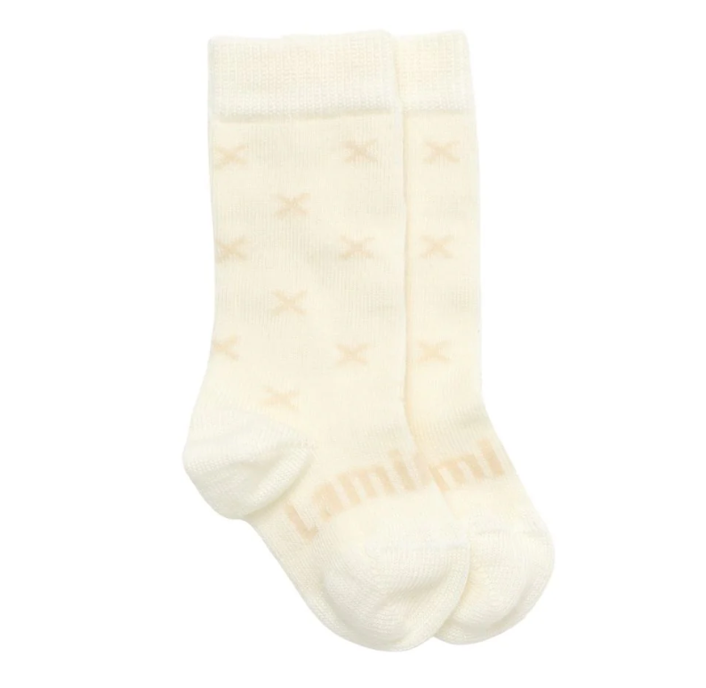 Natural with Oatmeal crosses merino wool knee-high socks for babies.