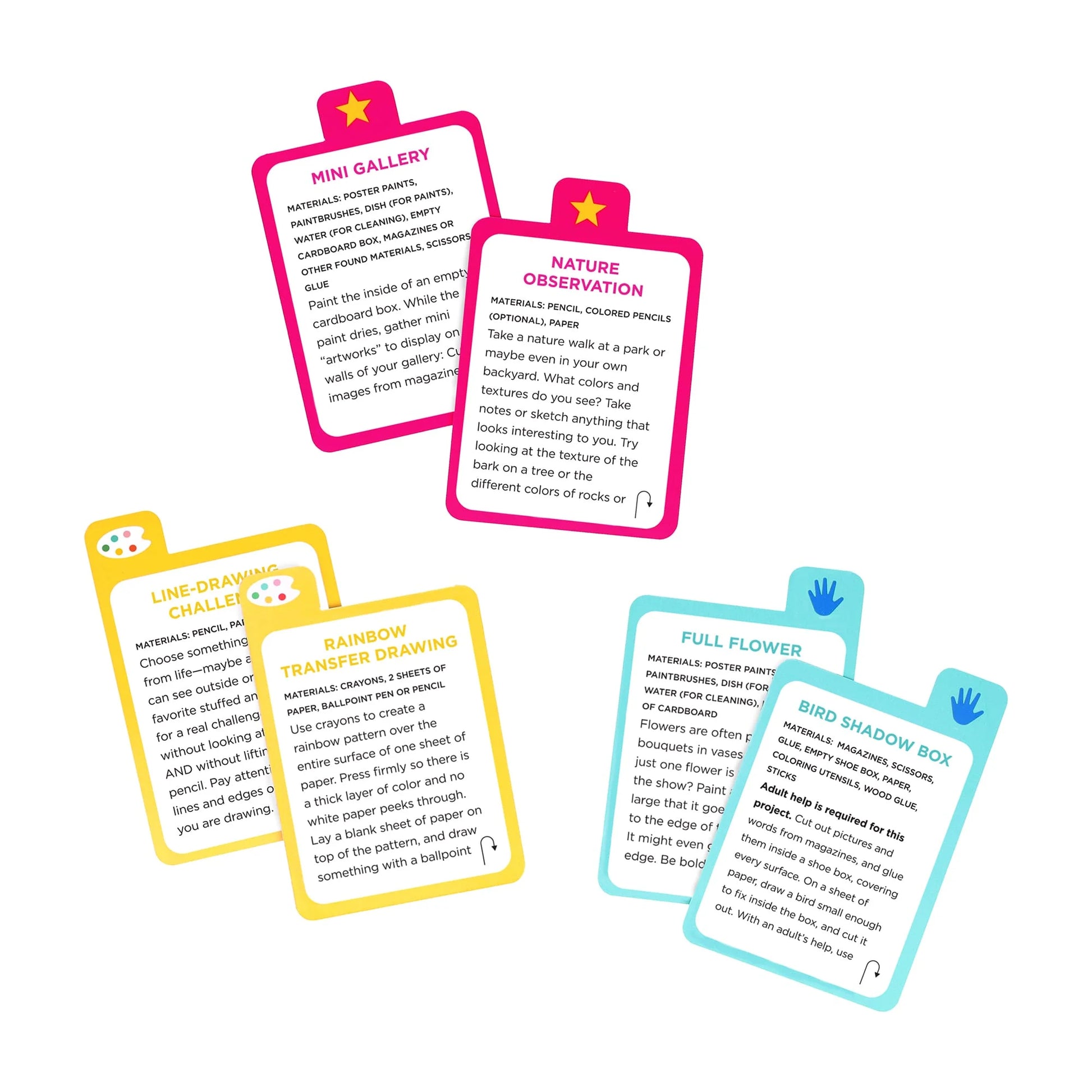 How about creating a blob painting? Or giving surrealism a try? Maybe make a foil sculpture? You can even go on an art hunt around your town! Choose cards with the palette icon if you’re feeling playful, the star icon if you want to be inspired, or the hand icon if you’re in the mood to make.