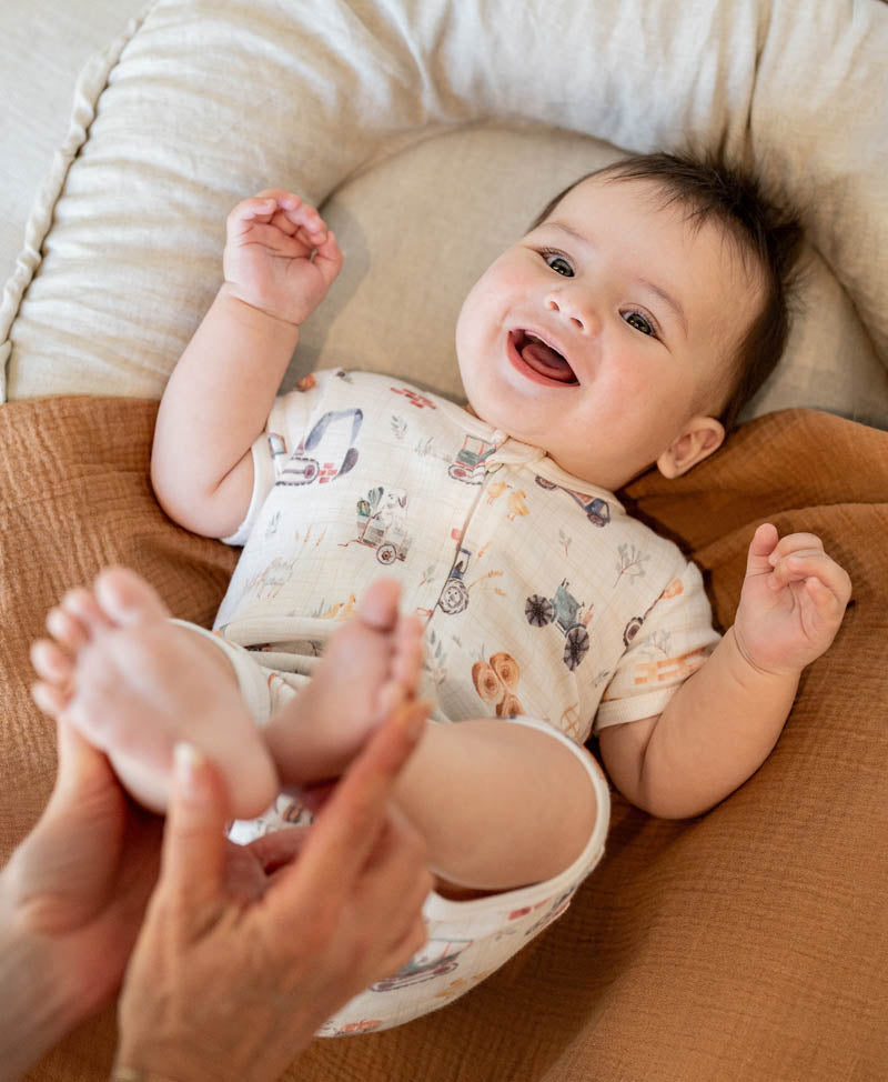 Perfect for little adventurers, our Farmyard Zip Romper is made from soft, breathable 100% organic cotton, designed with comfort and play in mind. Featuring a delightful farm-themed print, this short-sleeve romper is ideal for sunny days exploring or relaxing at home. The front zip allows for quick and easy changes, while the safety fold at the top ensures gentle protection for delicate skin.