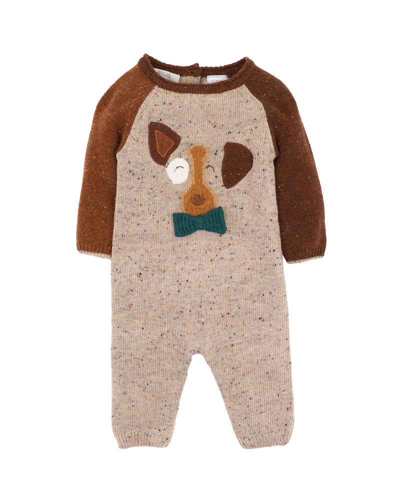This gorgeous wool blend knitted romper features a cute dog face embroidered graphic with bow tie on the front, contrast raglan sleeves with contrast tipping on cuffs and has a concealed crotch press stud opening and back neck button opening for ease of dressing. The perfect outfit to keep your little one looking stylish and warm.