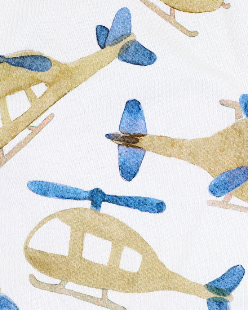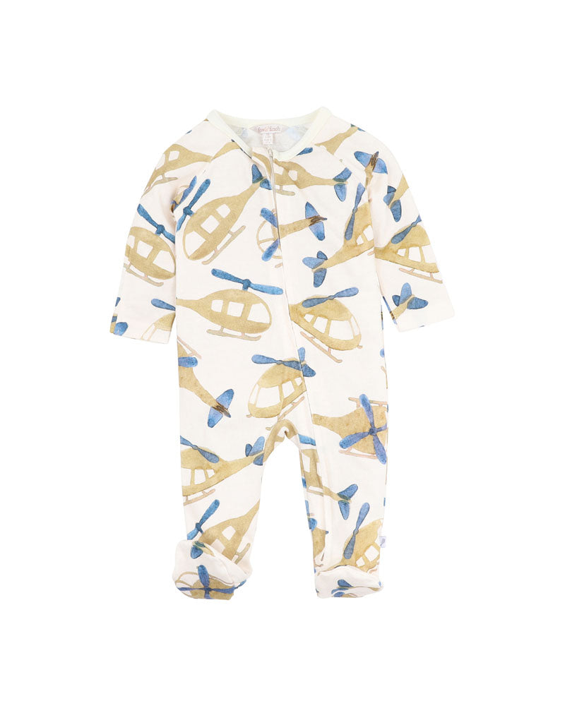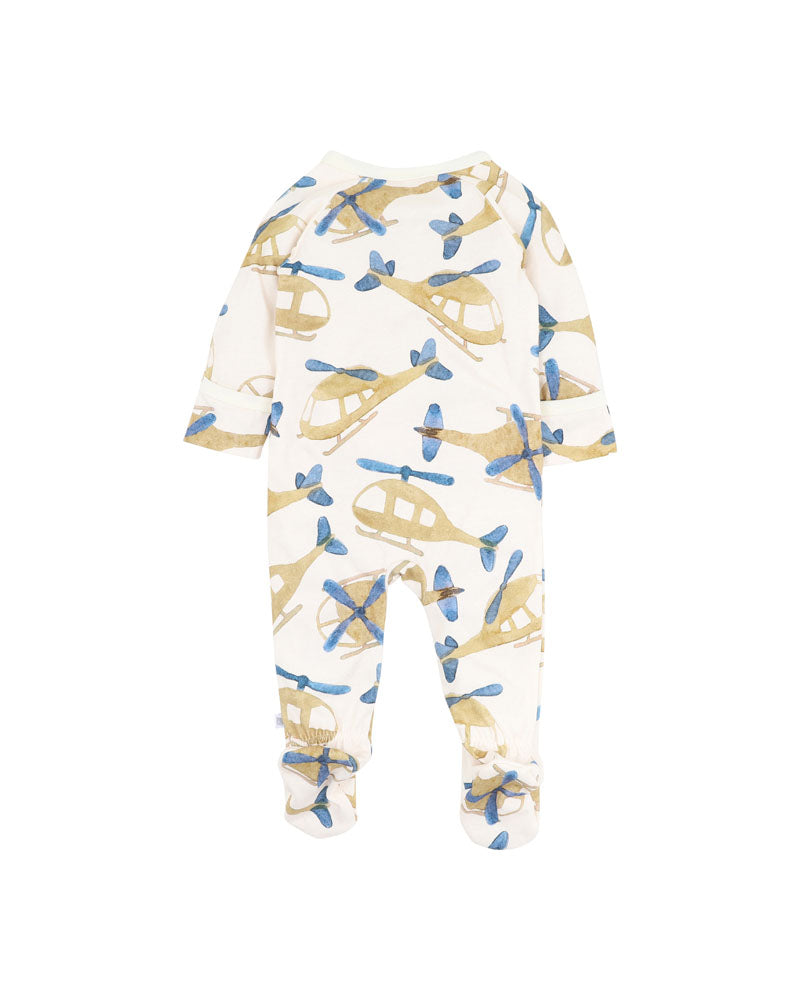 Keep your little one warm and cozy this winter in this long sleeve cotton romper featuring a cute helicopter print with contrast binding, a front zip for ease of dressing and nappy changes, enclosed feet and fold over mittens.