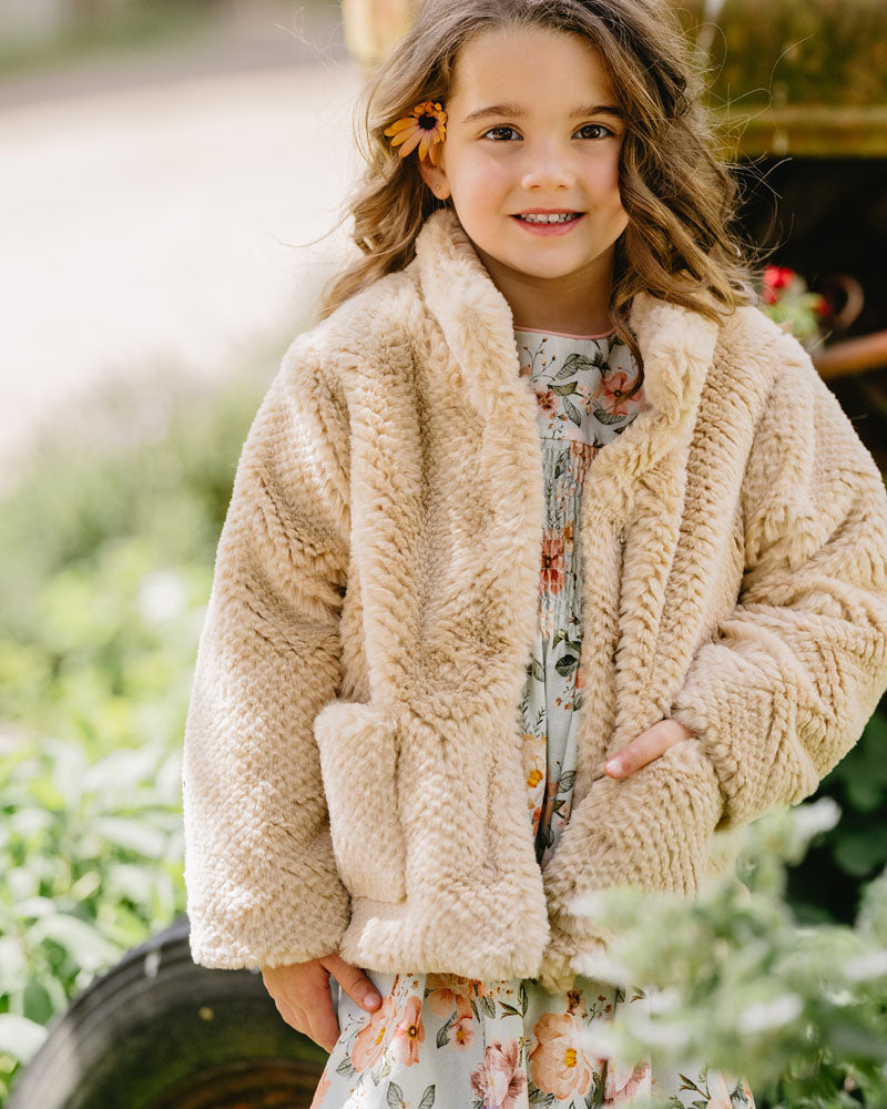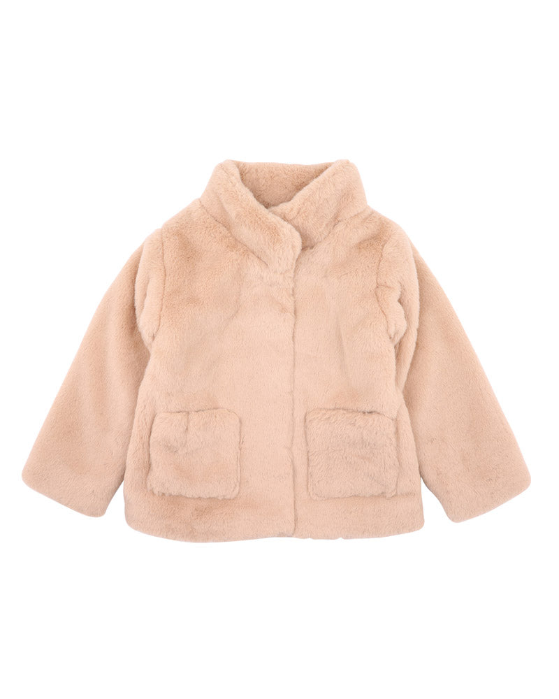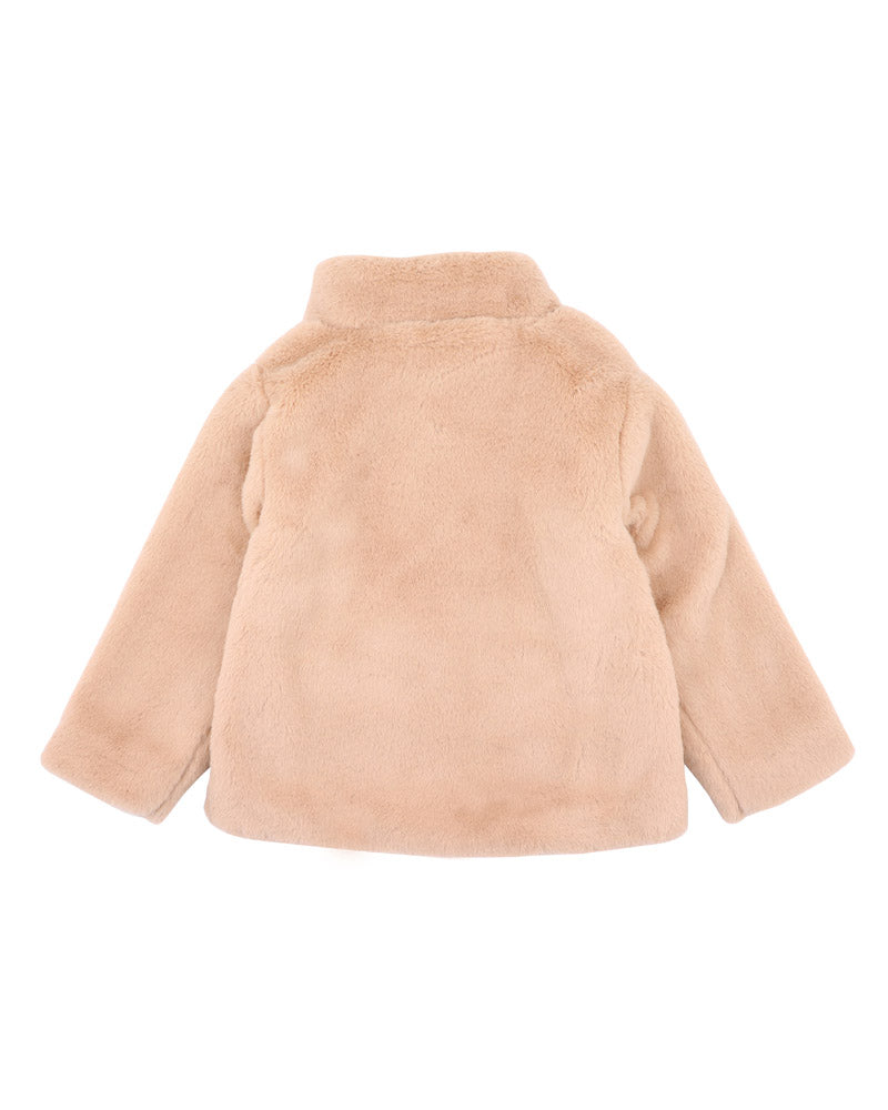 This latte textured faux fur jacket is comfy and warm for winter. It features front patch pockets, front snap closure for easy dressing and the cosy cotton lining giving it added warmth a must have for your little one's winter wardrobe.