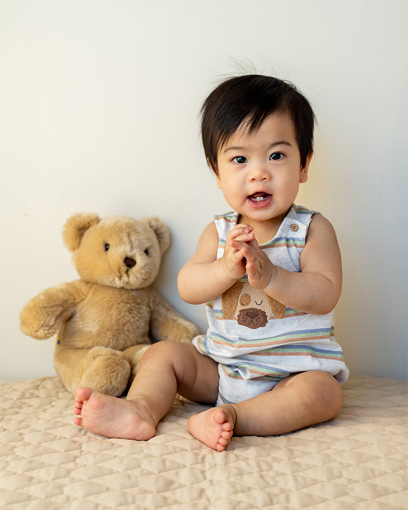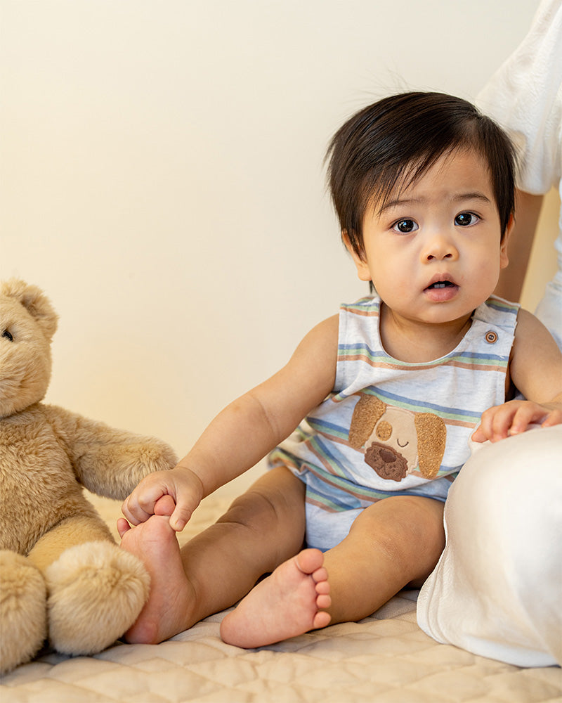 A playful pup for sunny day adventures. This striped romper is soft, sweet and full of fun, with an adorable tufted dog embroidery and soft pastel hues. Perfect for playtime or outings with mum and dad, it's designed for comfort and ease with simple fastenings and a relaxed fit.