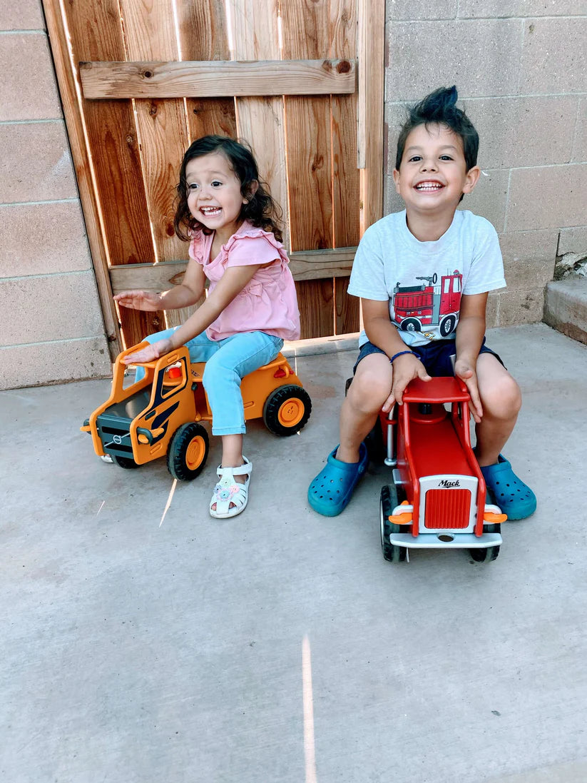 Moover has partnered with Mack to produce a licensed toy that both parents and children will love. Moover's biggest truck to date! Simple and stylish, this Danish-designed ride-on is not only sturdy and dependable to promote mobility, but has space in the back for transporting treasures and features a detachable crane.