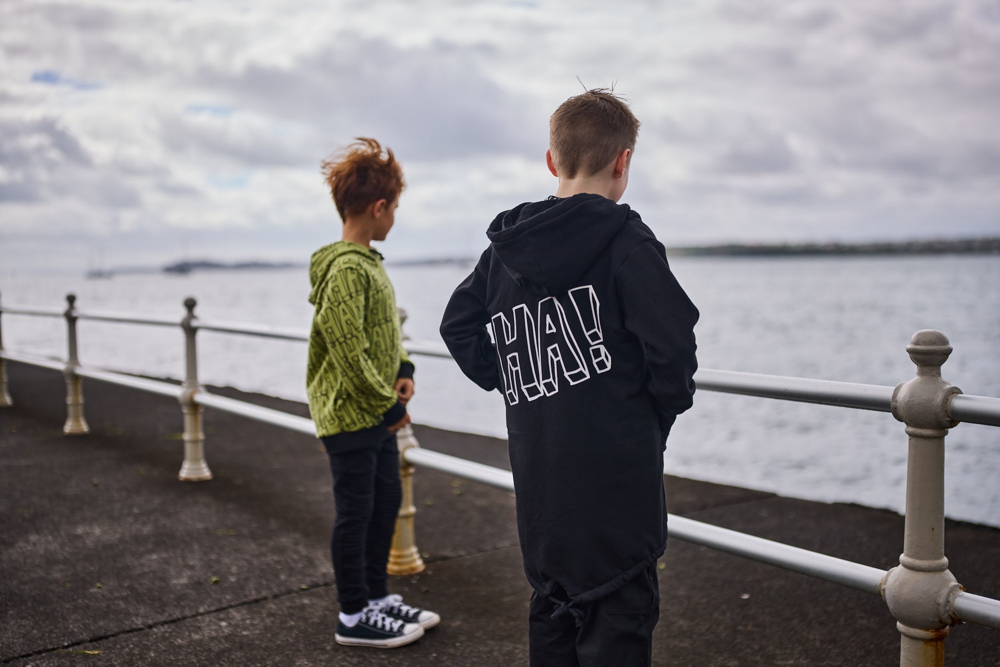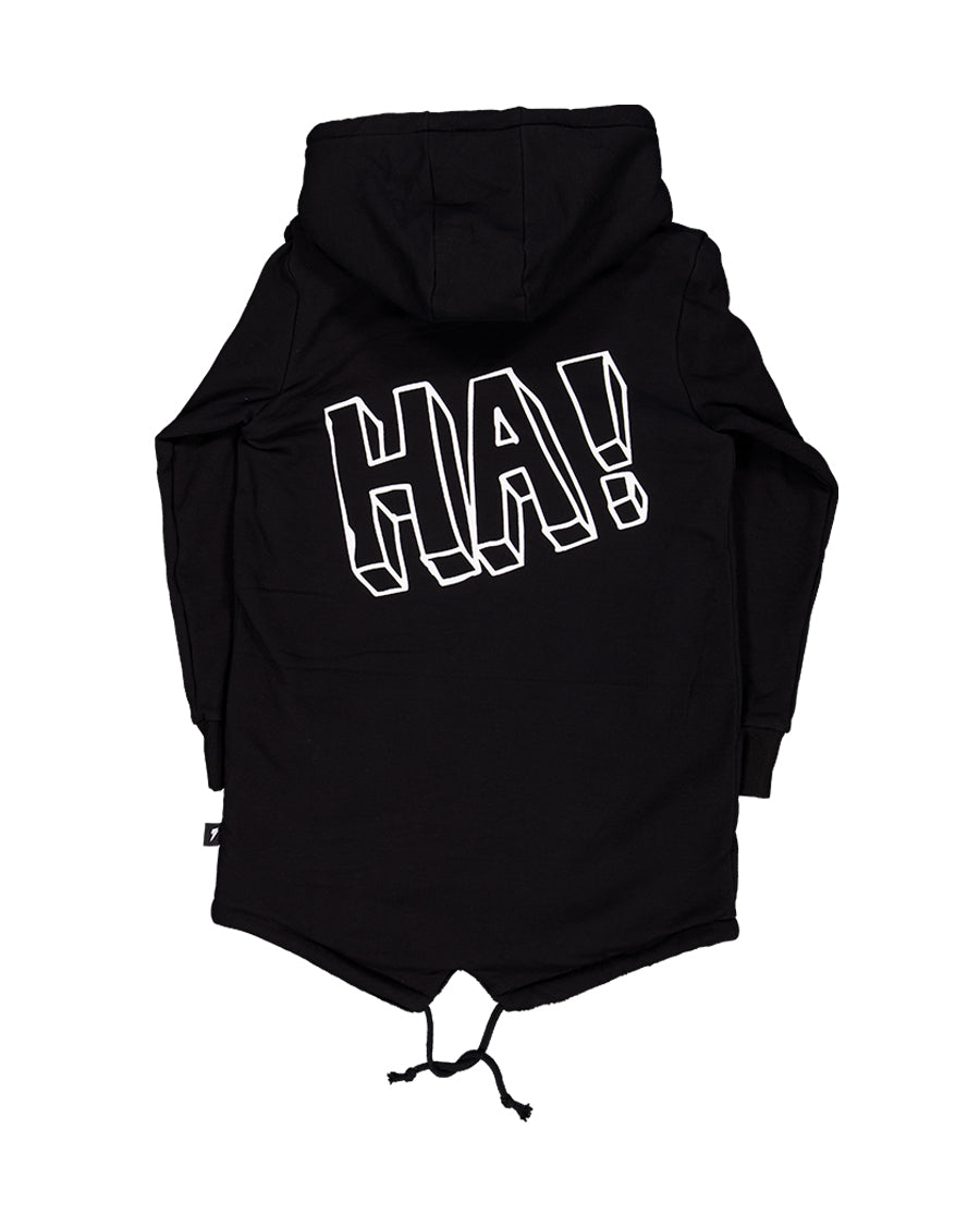 - ‘HA!’ placement print in white on reverse