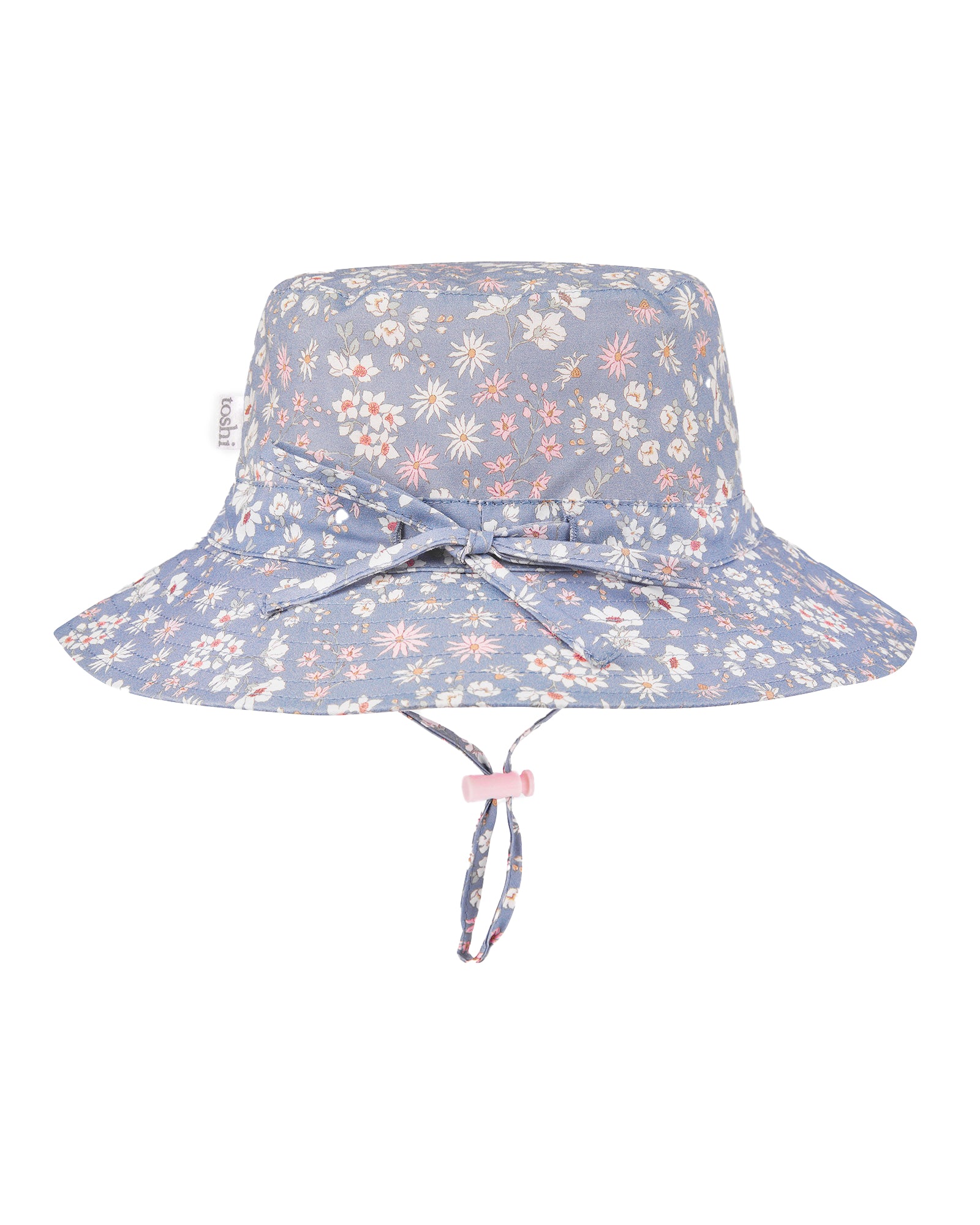 Toshi presents the classic Sunhat Eva, ideal for children of all ages. The broad and well-structured brim offers increased sun protection. A UPF 50 + UV rating is provided for colourway Dusk. A head tie creates adjustable sizing and the chin tie with toggle secures the hat for ease of wear. The security release clasp on the chin tie is designed to enhance wearer safety. The classic Toshi Sunhat is crafted from the finest quality 100% cotton and is fully lined for additional comfort. An original and exclusive Toshi print design is featured.